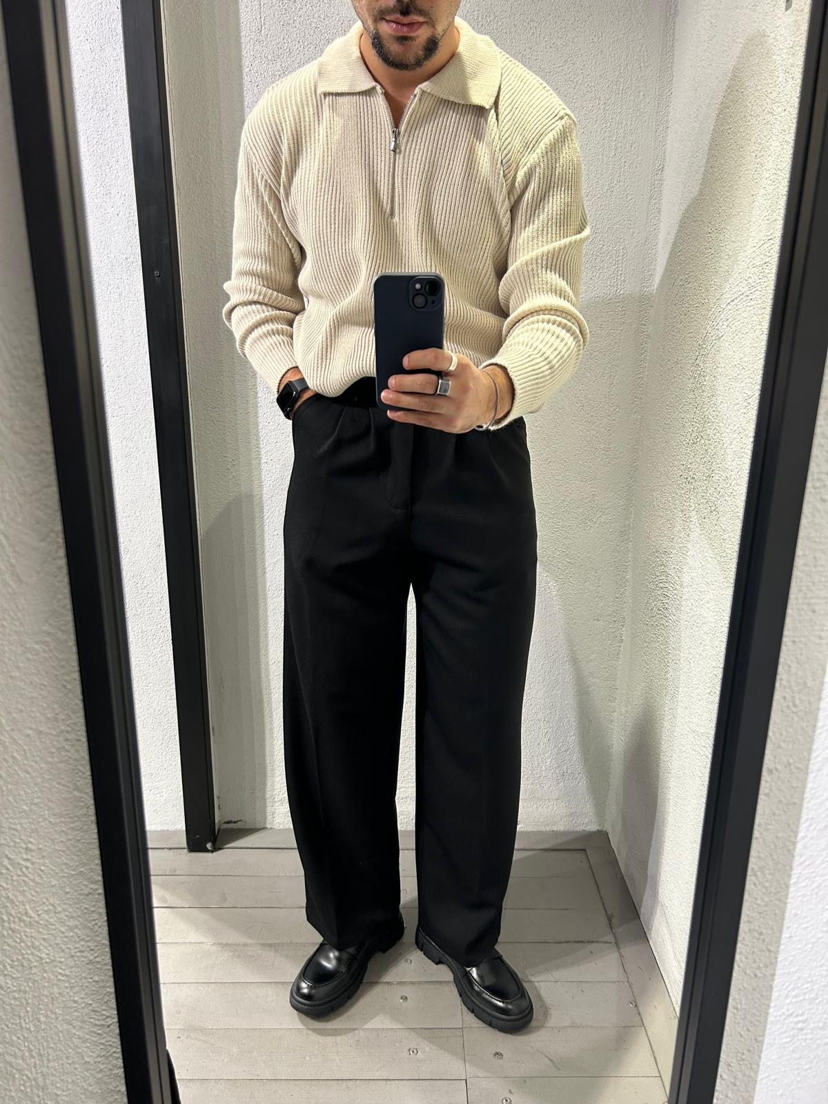 - Pantalone vita alta dalla vestibilità oversize con elastico sul retrovita, chiusura con bottone frontale, doppia pence e fondo ampio 26cm.