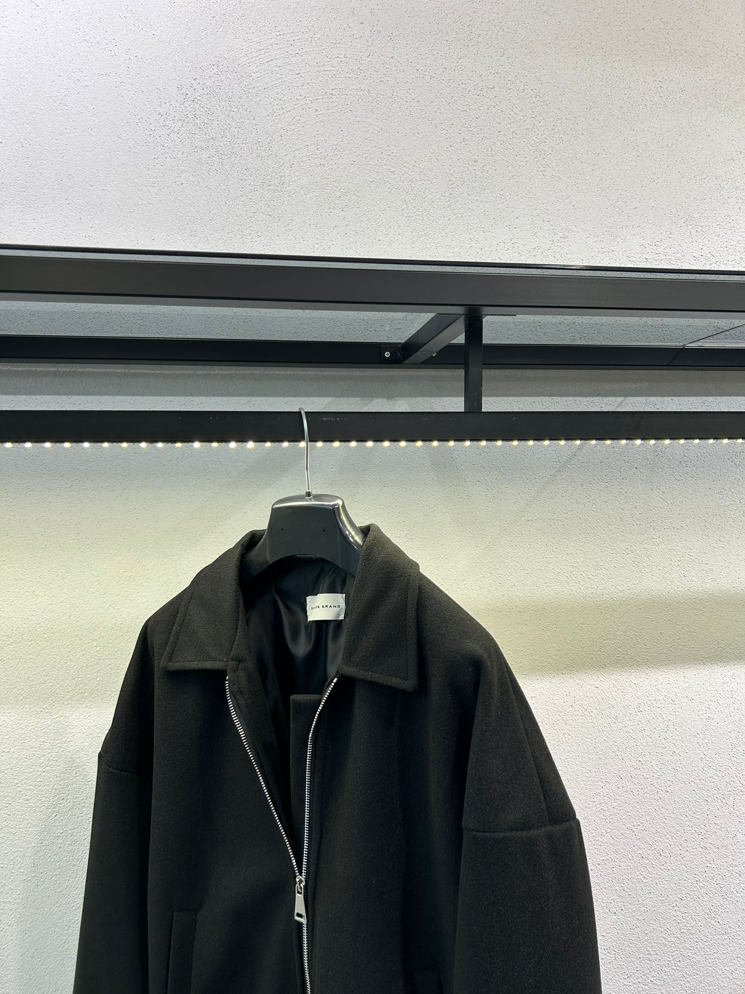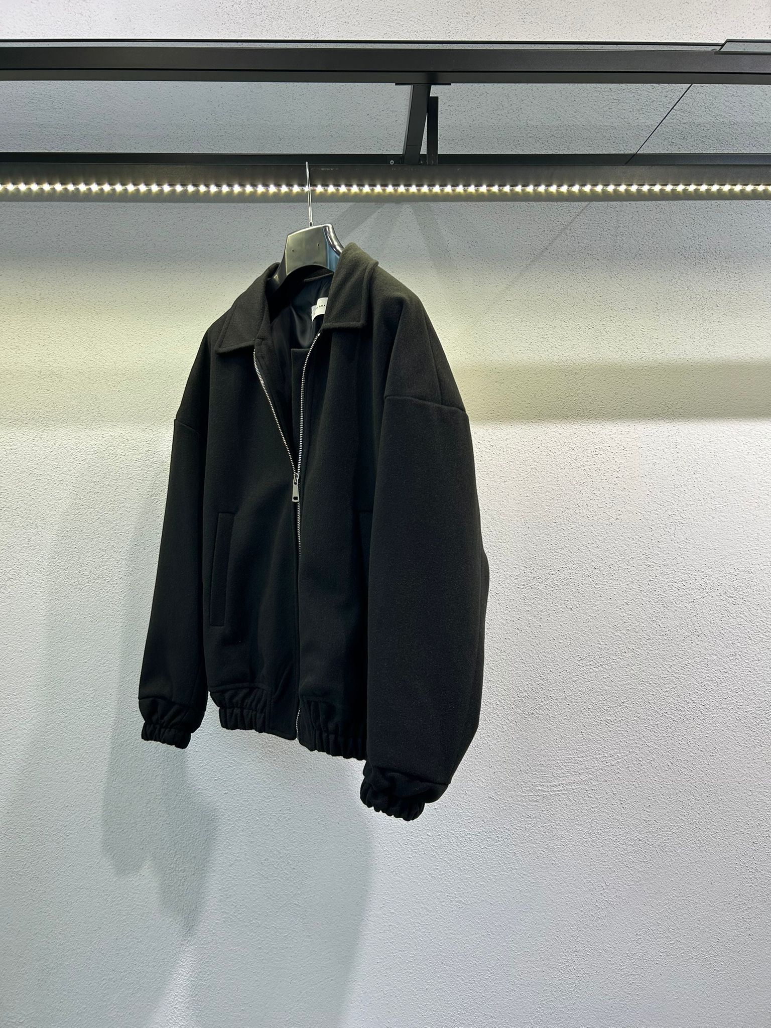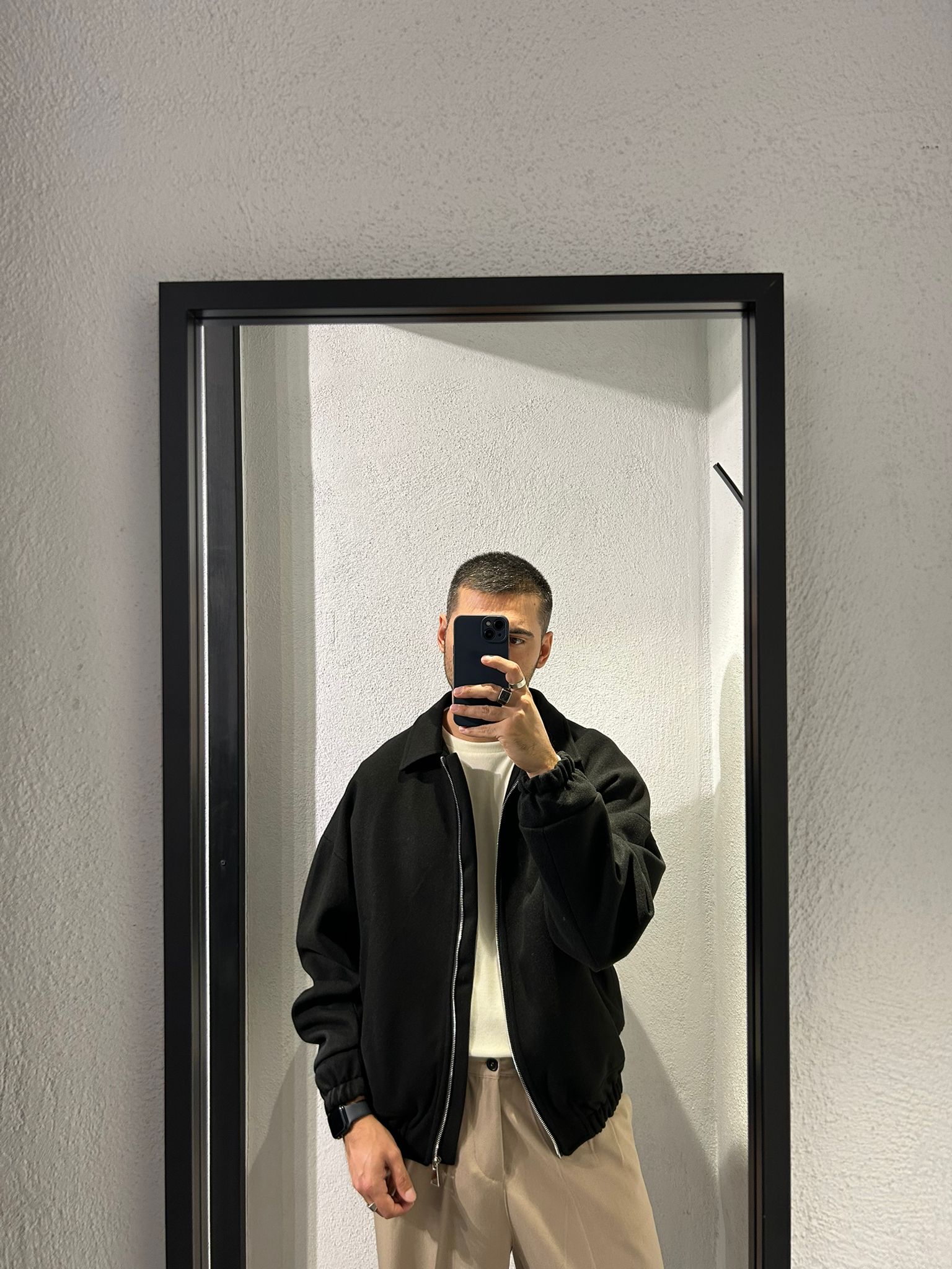 - Giubbino modello college realizzato in tessuto panno con colletto, chiusura zip frontale, tasche a filo ed elastico sul fondo e polsini.