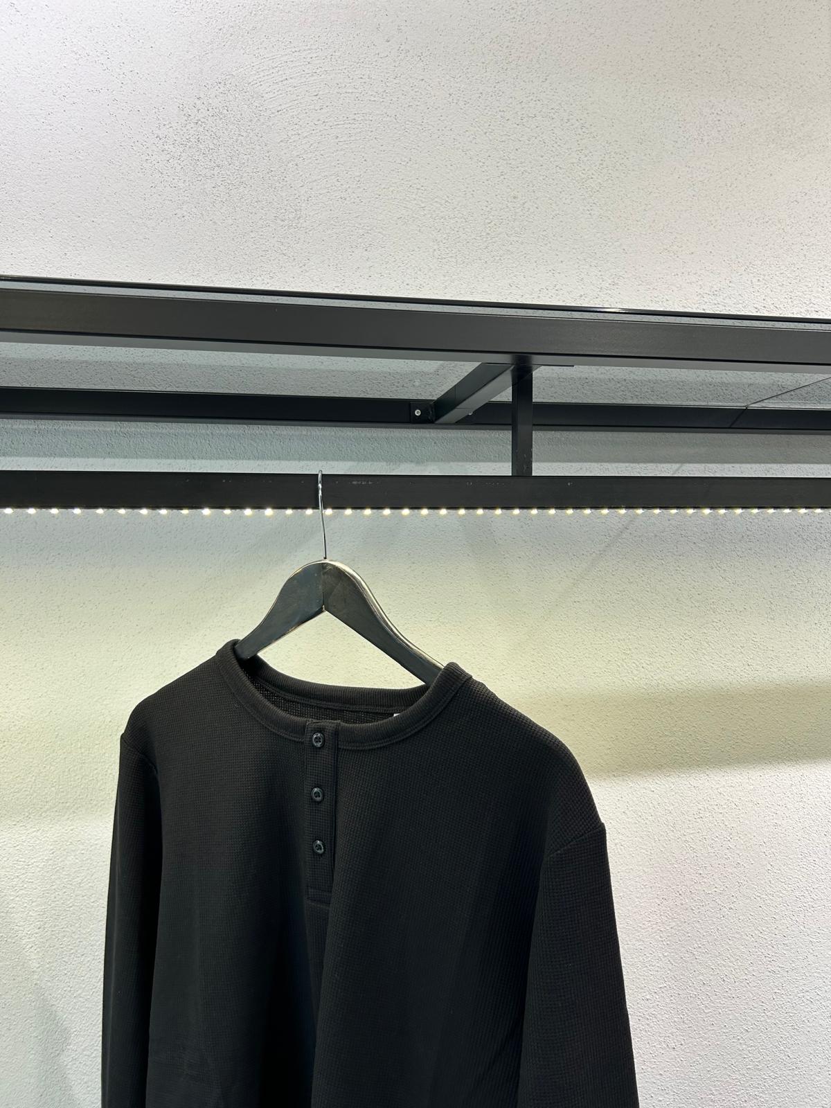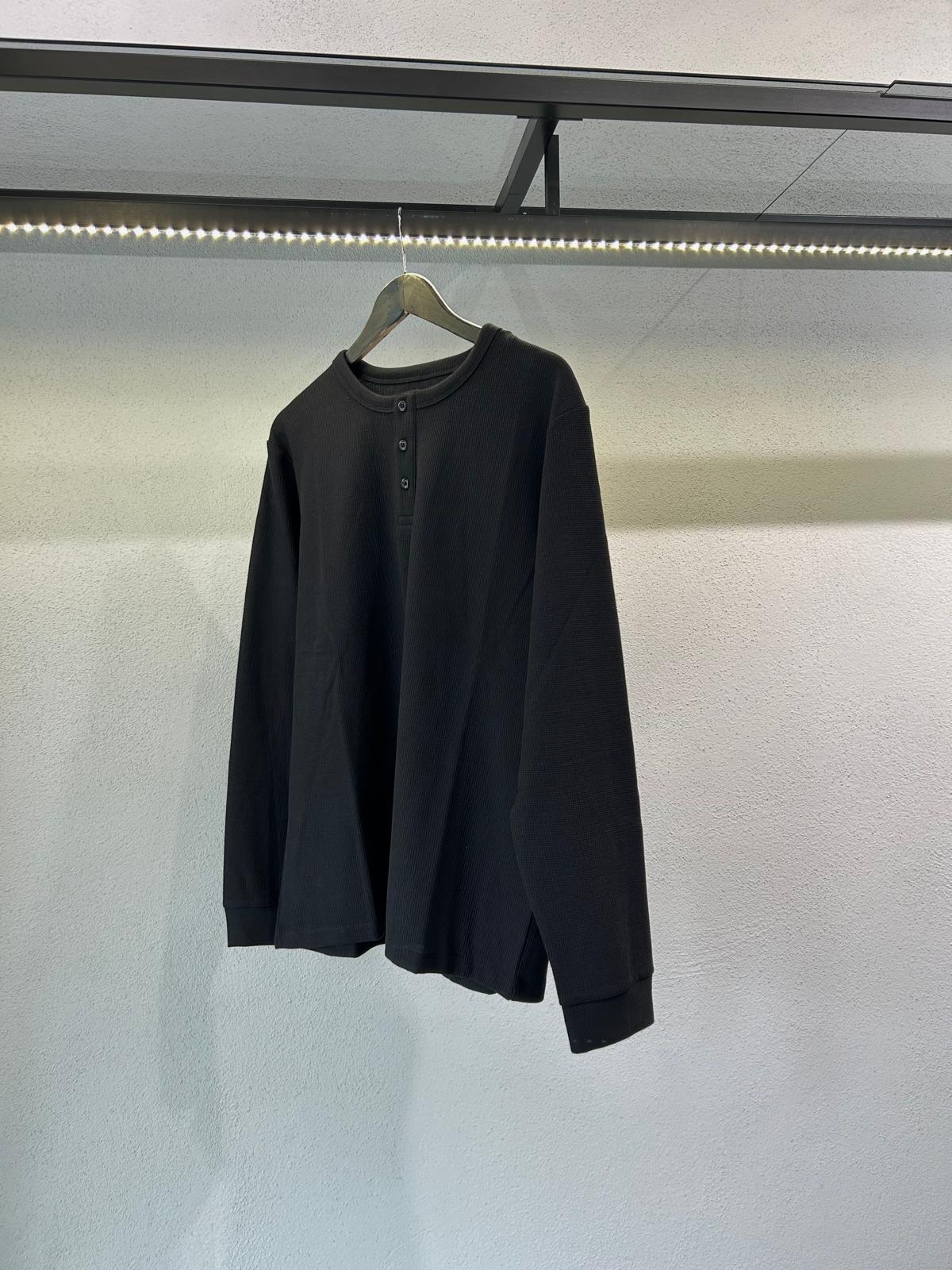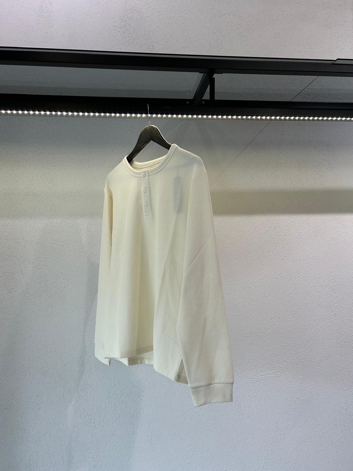 - T shirt dalla vestibilità comoda realizzata in tessuto nido d'ape, modello serafino manica lunga con chiusura a tre bottoni frontali.
