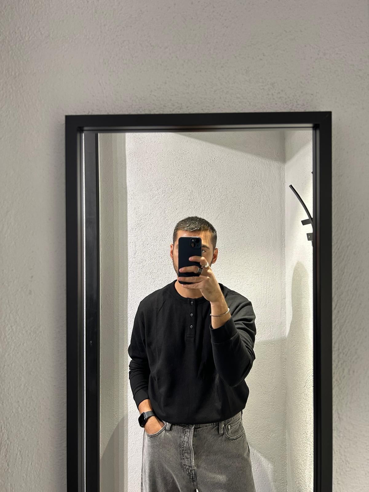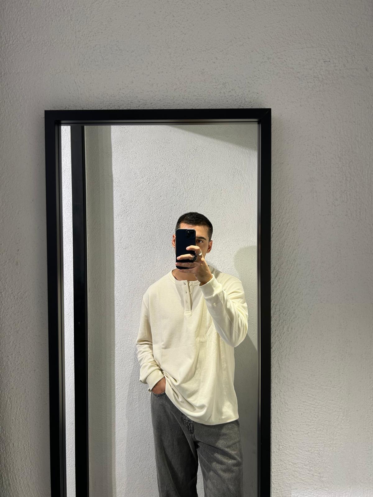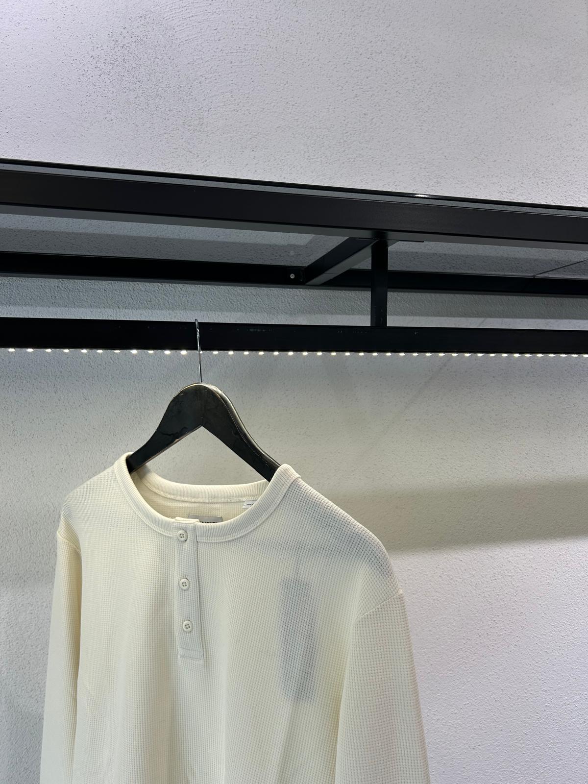 - T shirt dalla vestibilità comoda realizzata in tessuto nido d'ape, modello serafino manica lunga con chiusura a tre bottoni frontali.