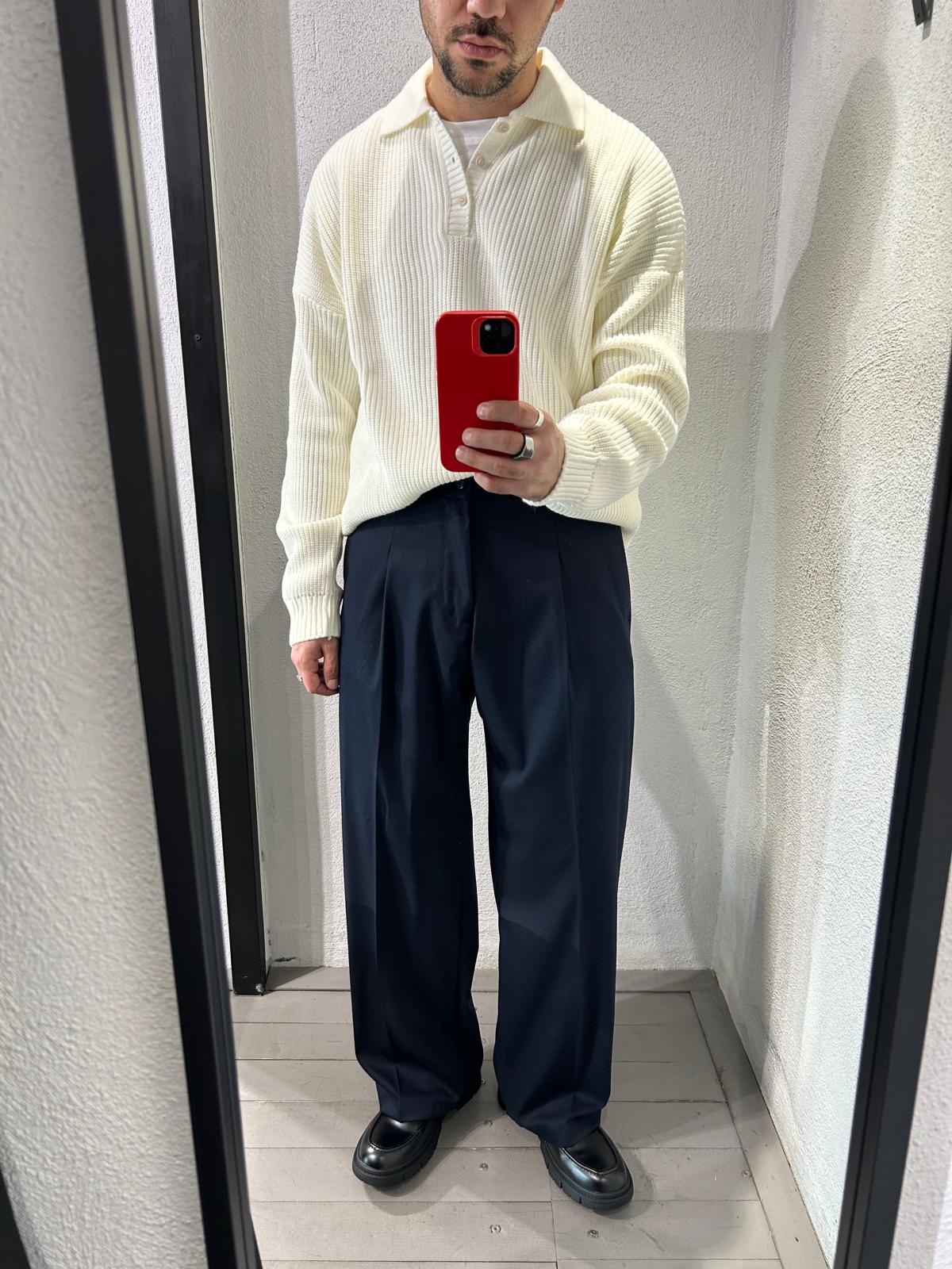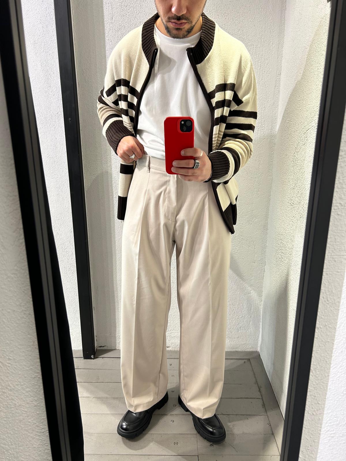 - Pantalone dalla vestibilità over con chiusura bottone frontale, elastico sul retrovita, pences frontali e fondo largo 25cm.