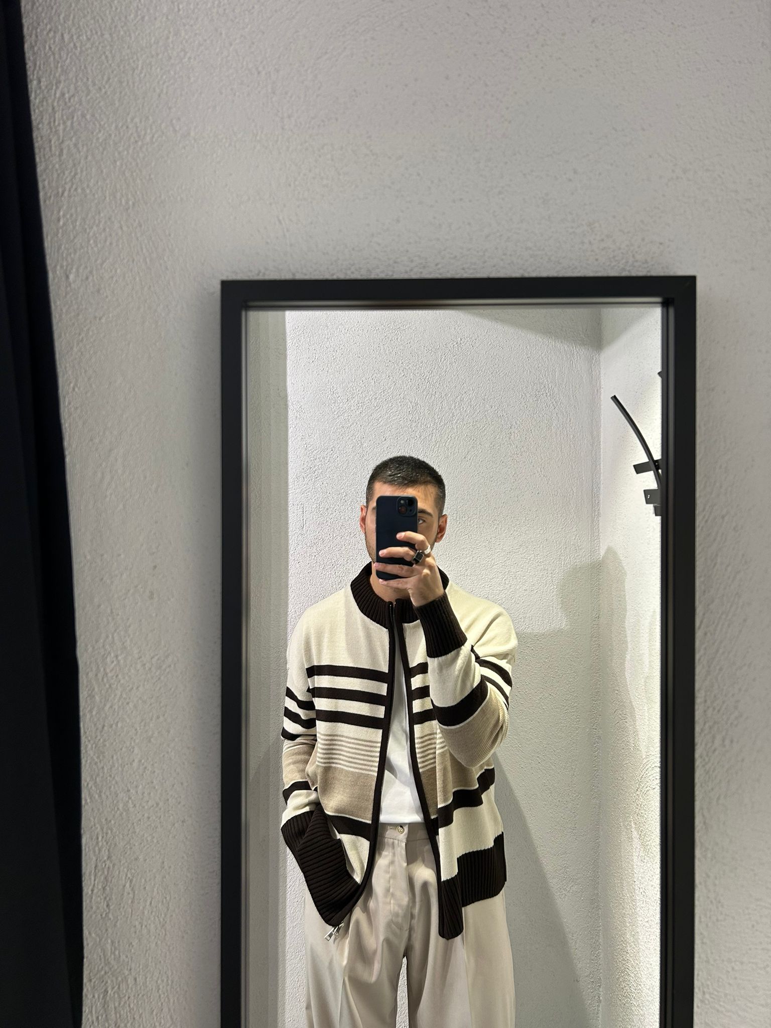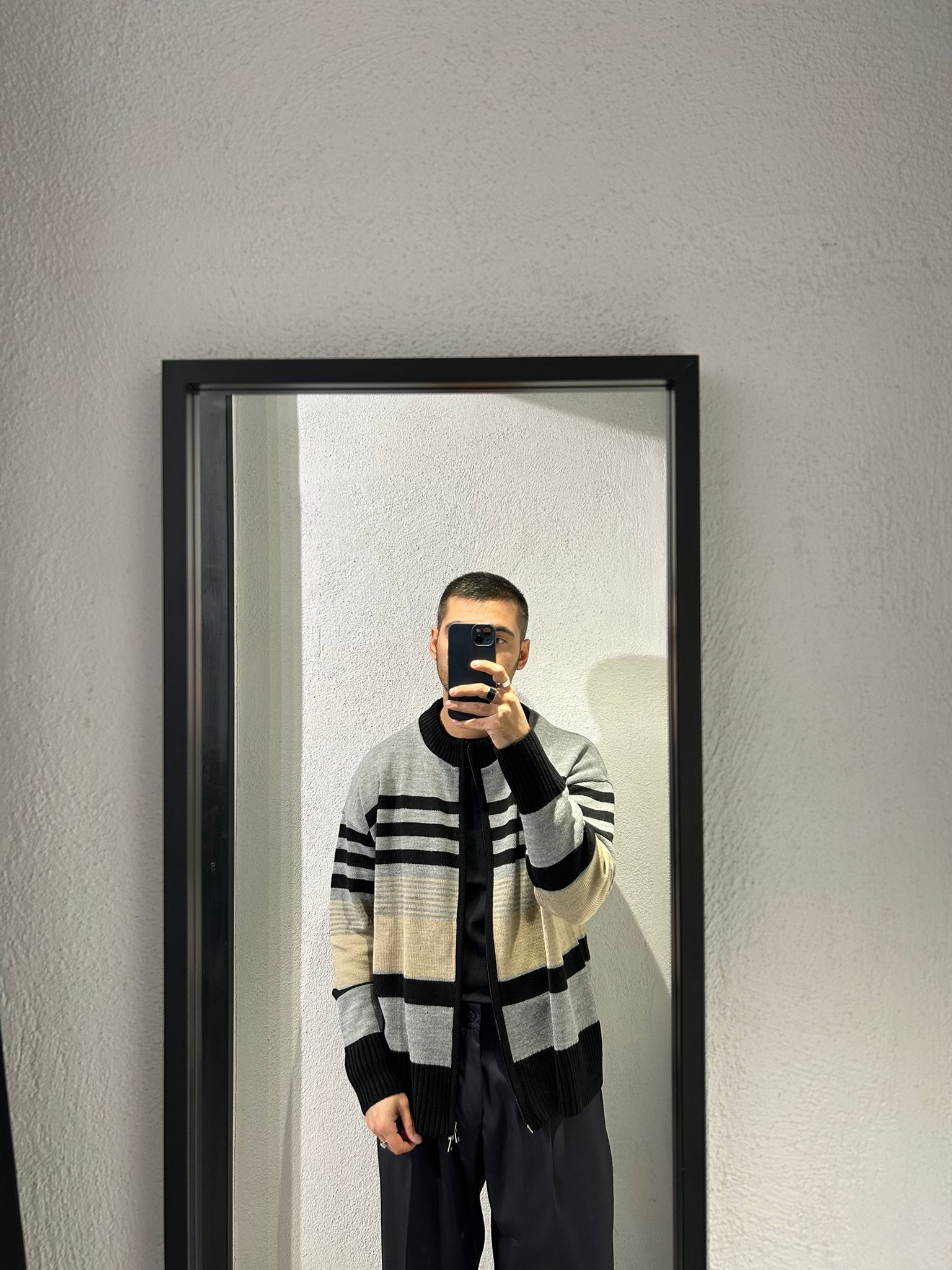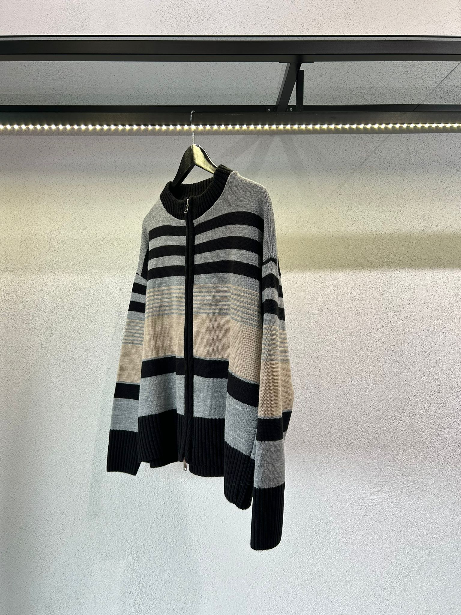 - Cardigan dalla vestibilità leggermente comoda realizzato in misto lana con zip doppio cursore, mezzo colletto e trama a fasce multicolore.